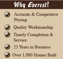 If you are considering building a new home, remodeling or maybe a new addition and want to have a wonderful experience, visit Everest Custom Homes. You will build a relationship with one of our team members; which will work with you from start to finish. They will oversee every aspect of your home construction project.